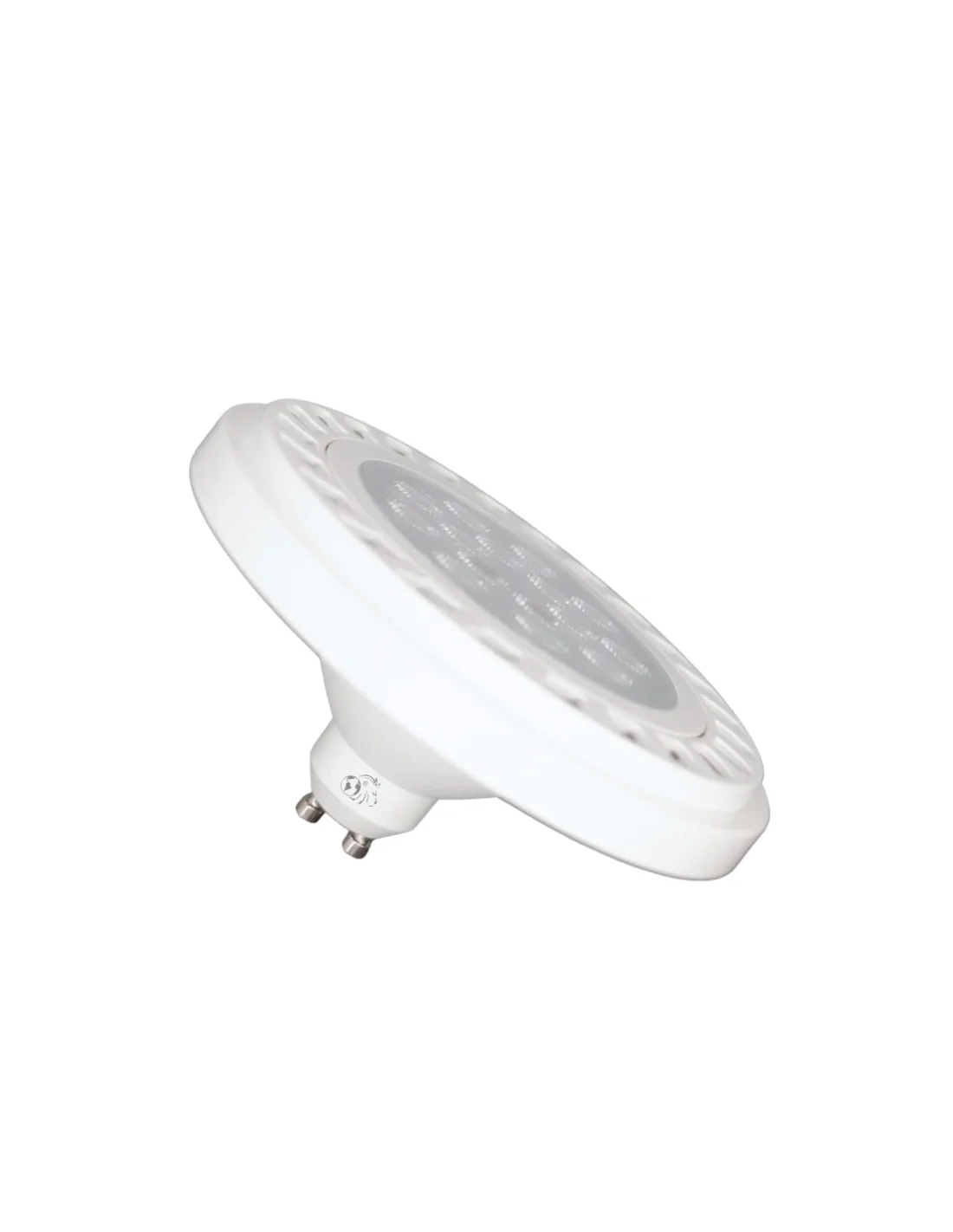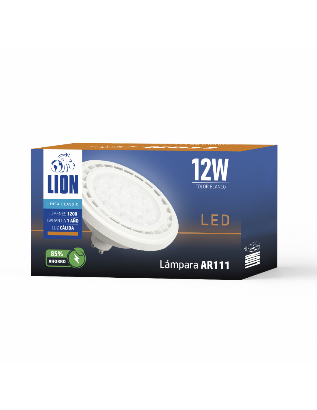 Lámpara AR111 LED de 12W en luz cálida, con 1200 lúmenes y ángulo de apertura de 45°, ideal para iluminación focal precisa y de alto impacto. Fabricada en aluminio y PVC para una eficiente disipación térmica y mayor durabilidad. Base GU10 que permite una instalación práctica y segura. Recomendada para aplicaciones comerciales y espacios que requieren acento lumínico definido y alto rendimiento. Base blanca.