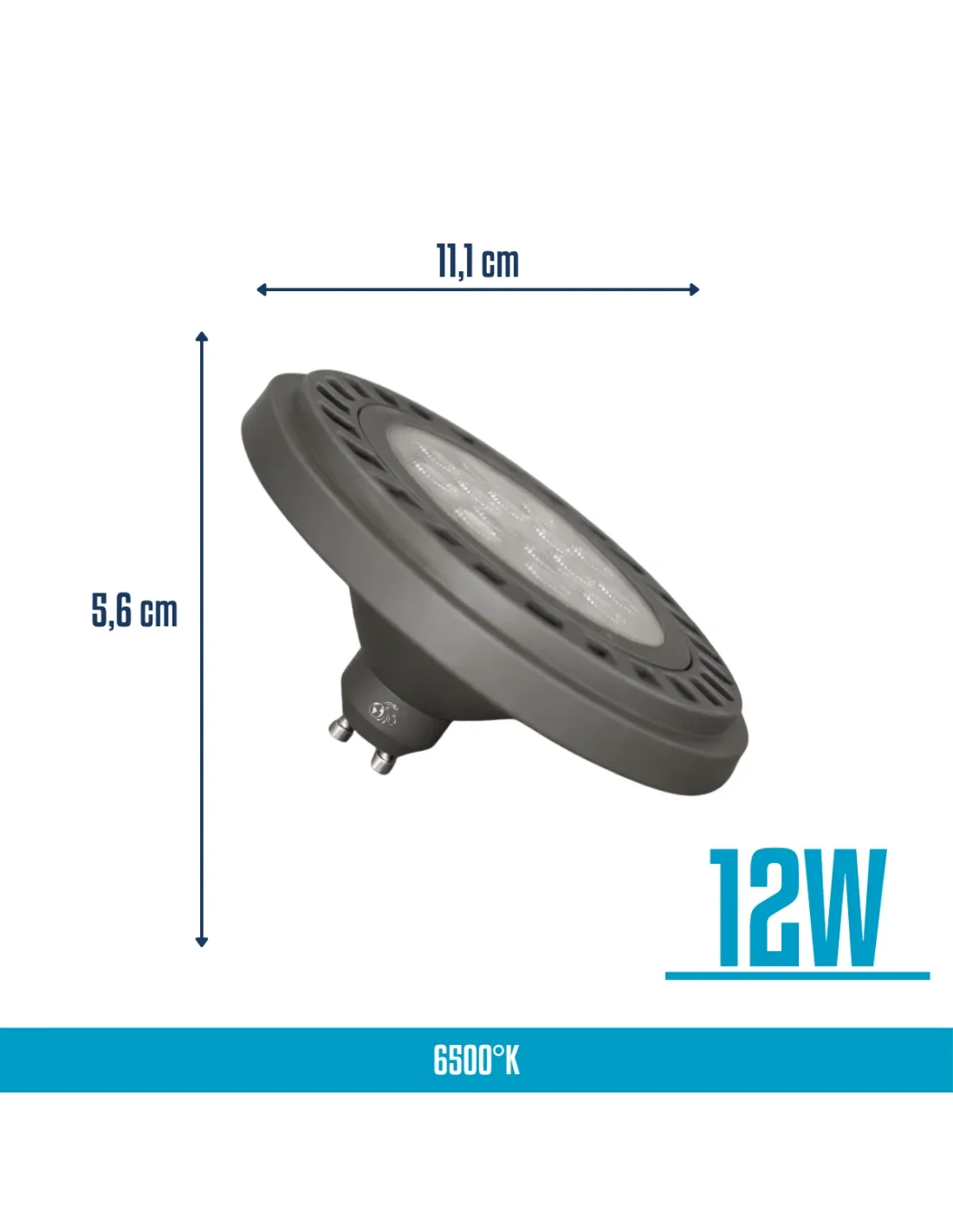 Lámpara AR111 LED de 12W en luz fría, con 1200 lúmenes y ángulo de apertura de 45°, ideal para iluminación focal precisa y de alto impacto. Fabricada en aluminio y PVC para una eficiente disipación térmica y mayor durabilidad. Base GU10 que permite una instalación práctica y segura. Recomendada para aplicaciones comerciales y espacios que requieren acento lumínico definido y alto rendimiento. Base gris.