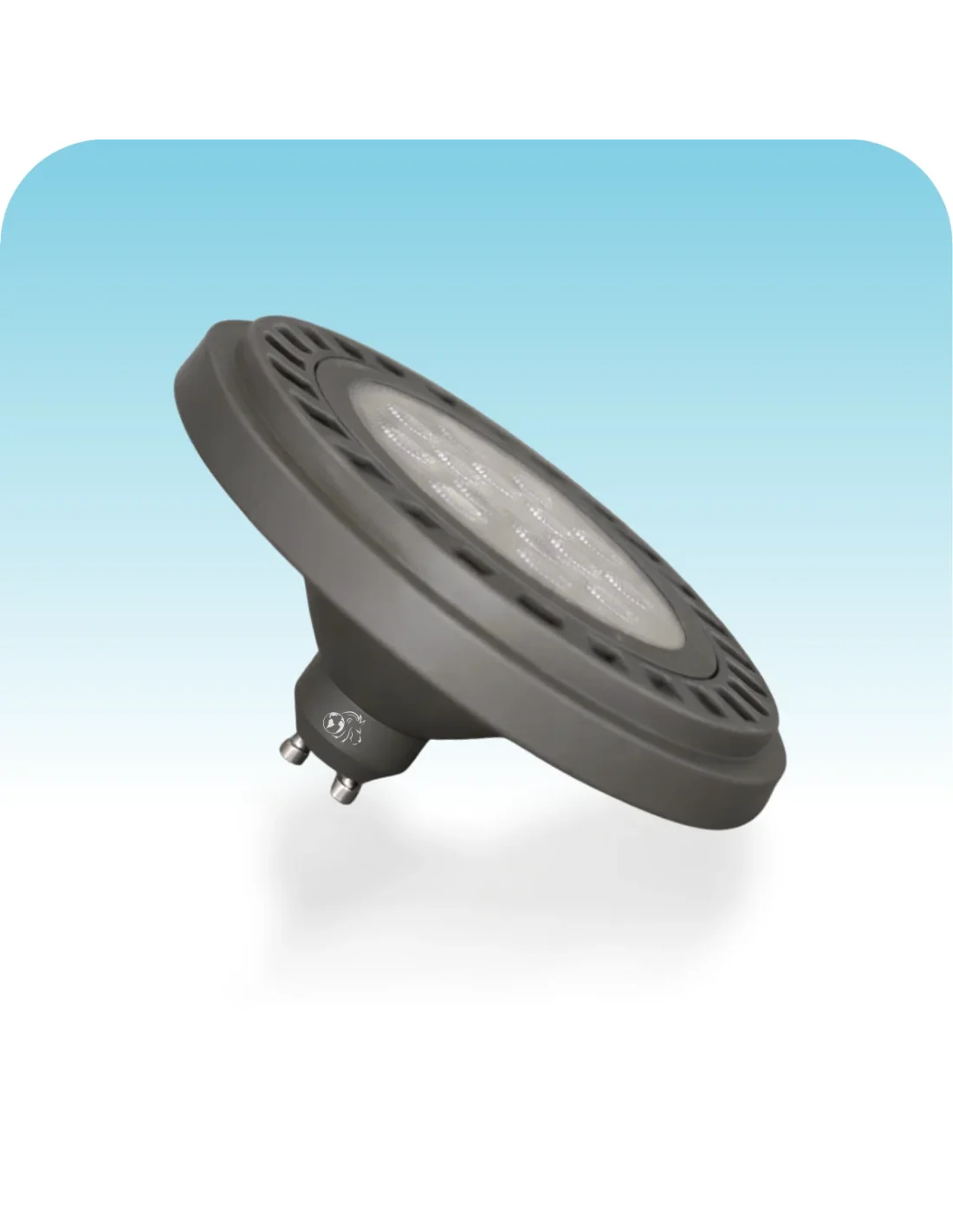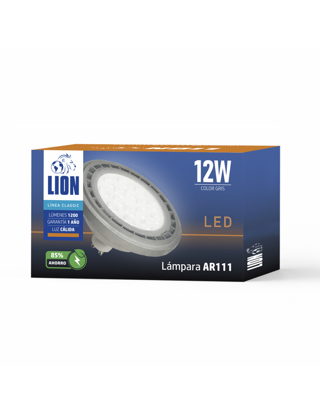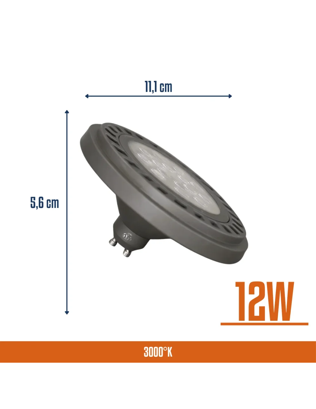 Lámpara AR111 LED de 12W en luz cálida, con 1200 lúmenes y ángulo de apertura de 45°, ideal para iluminación focal precisa y de alto impacto. Fabricada en aluminio y PVC para una eficiente disipación térmica y mayor durabilidad. Base GU10 que permite una instalación práctica y segura. Recomendada para aplicaciones comerciales y espacios que requieren acento lumínico definido y alto rendimiento. Base gris.