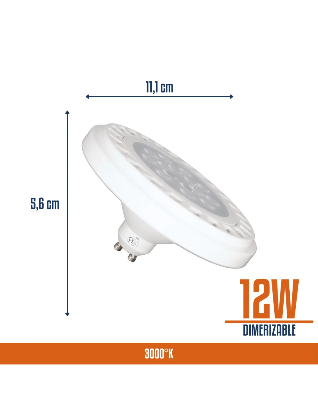 Lámpara AR111 LED de 12W en luz cálida, con 1200 lúmenes y ángulo de apertura de 45°, ideal para iluminación focal precisa y de alto impacto. Fabricada en aluminio y PVC para una eficiente disipación térmica y mayor durabilidad. Base GU10 que permite una instalación práctica y segura. Recomendada para aplicaciones comerciales y espacios que requieren acento lumínico definido y alto rendimiento. Base blanca.. Cuenta con función dimerizable, permitiendo regular la intensidad de luz según la necesidad del ambiente. Esto brinda mayor control, confort visual, ahorro energético y versatilidad para adaptar la iluminación a distintos momentos y usos. Ideal para lograr una iluminación focal clara, eficiente y ajustable en espacios comerciales y residenciales.