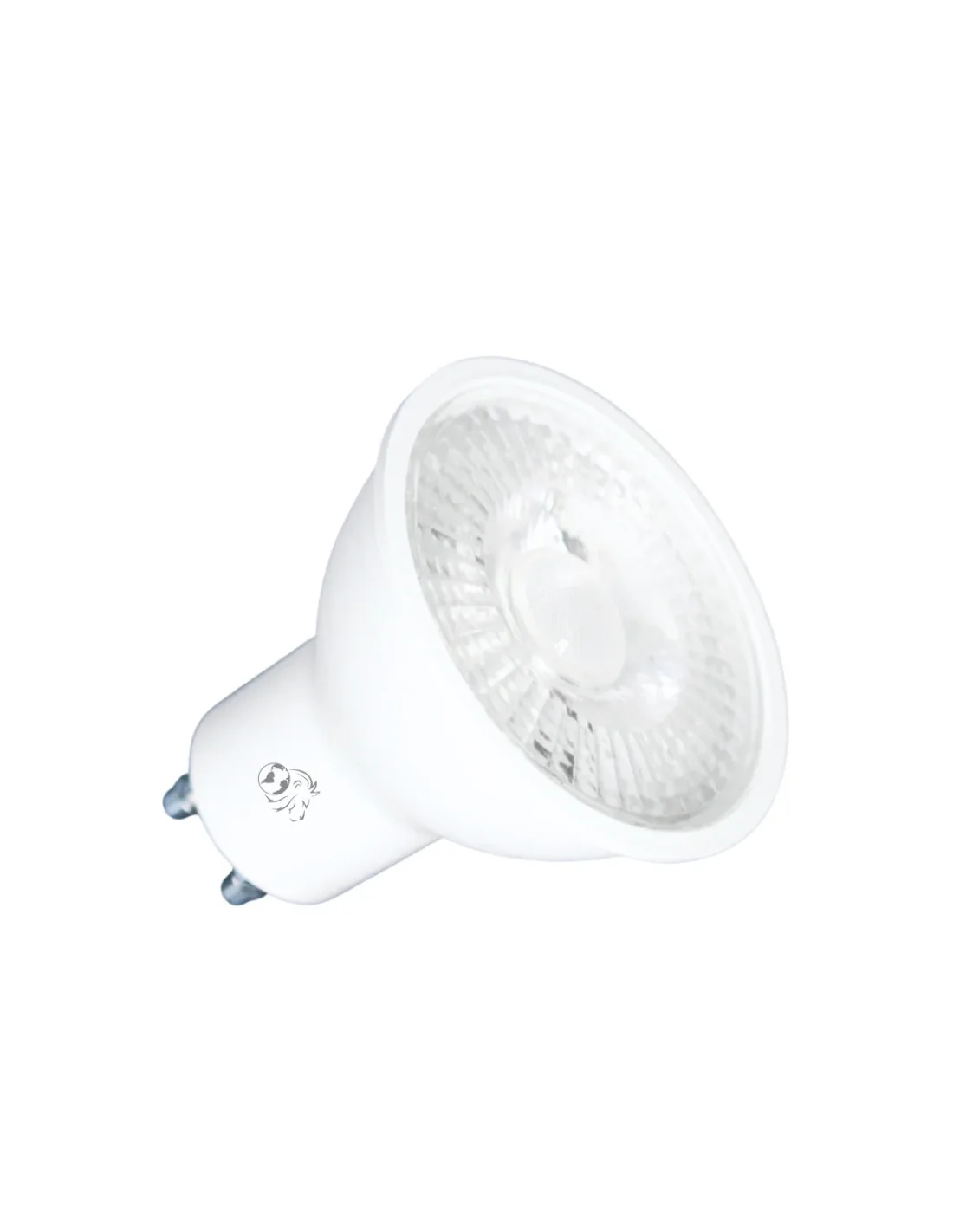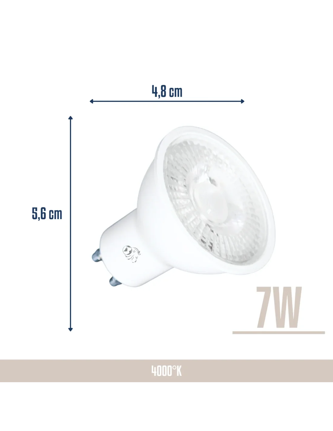 Lámpara dicroica lupa LED de 7W en luz neutra, con 570 lúmenes de alto rendimiento lumínico. Fabricada en aluminio y PVC para una óptima disipación térmica y mayor vida útil. Base GU10 para instalación directa y segura. El ángulo de iluminación que otorga es de 38°, ideal para lograr una iluminación focal clara, definida y eficiente en espacios comerciales y residenciales.