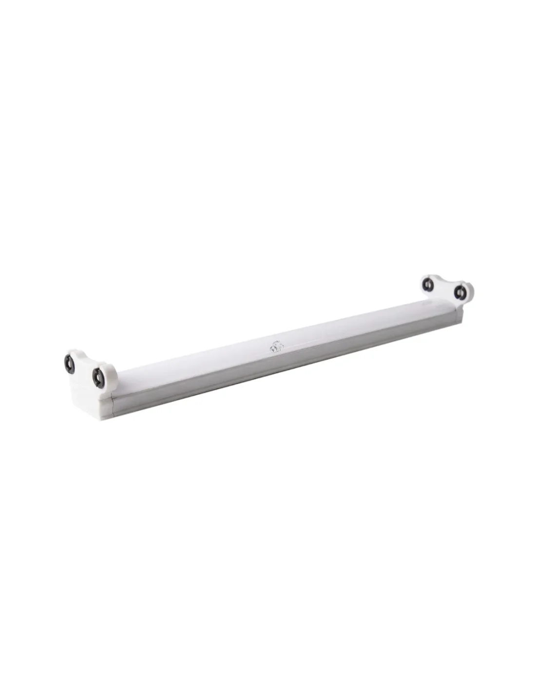 Listón de chapa de acero doble para tubos LED T8 de 9W, con base G13. Diseñado para alojar dos tubos, ofreciendo mayor nivel de iluminación en una misma estructura.