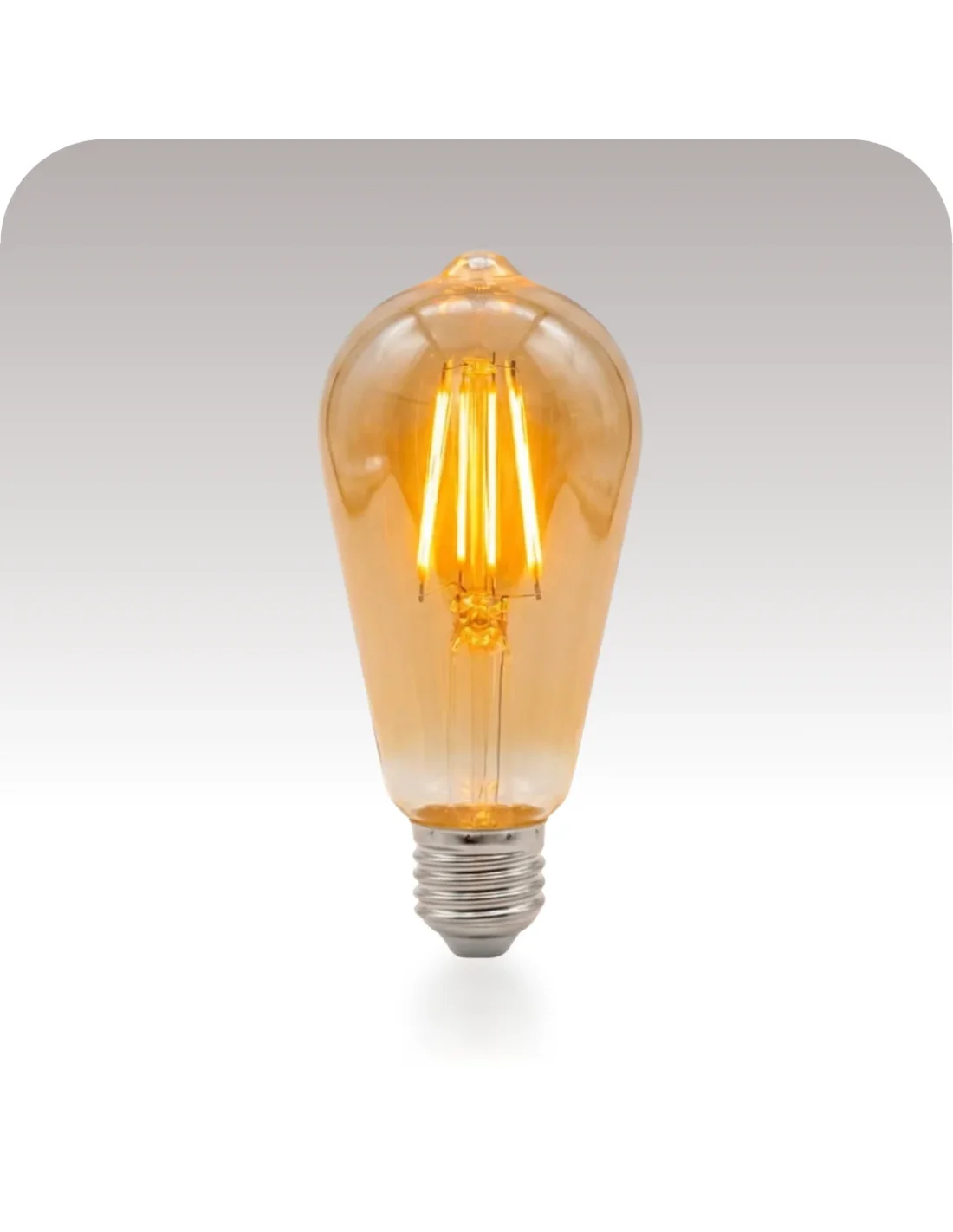 Lámpara filamento ST64 de 4W, diseñada para realzar espacios con una estética vintage y sofisticada. Su vidrio color ámbar potencia la calidez de la luz, generando una ambientación tenue y decorativa. Con base E27 y un flujo de 320 lúmenes, es ideal para lámparas colgantes, bares, locales gastronómicos y proyectos donde el diseño y la atmósfera son el diferencial.